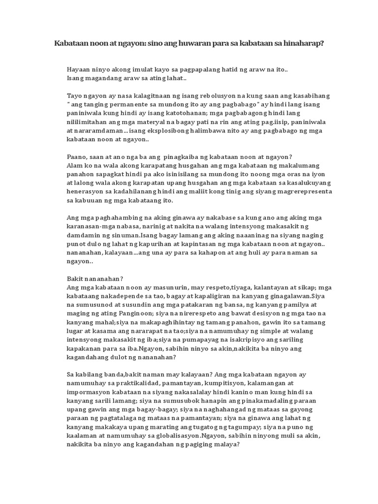 Makikita mo nalang ang mga kabataan nasa mall sa mga computer shop sa mga bar at sa mga gilid tumatabay at nakakalimutan na nila ang kanilang ibang prioridad. Ang panitikan din noon ay mas maka-Tagalog dahil sa paggamit ng mga salitang pormal pambansa o pampanitikang mga salita. 242021 KABATAAN NOON AT NGAYON Sa paksang ito ating tatalakayin kung ano nga ba ang mga pagkakaiba at mga pagkakatulad ng mga kabataan sa sinaunang panahaon at ngayon.