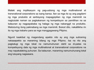 Ang Multinasyonal na kompanya ay maroon dalawang salita na tinatawag na Multi at Nasyonal na ang ibig sabihin ay meron itong headquarter sa. Ang produkto na kanilang ipinagbibili ay hindi nakabatay sa lokal na pangangailangan ng pamilihan. In the face of the rapidly changing world a form of almost pure capitalism has.