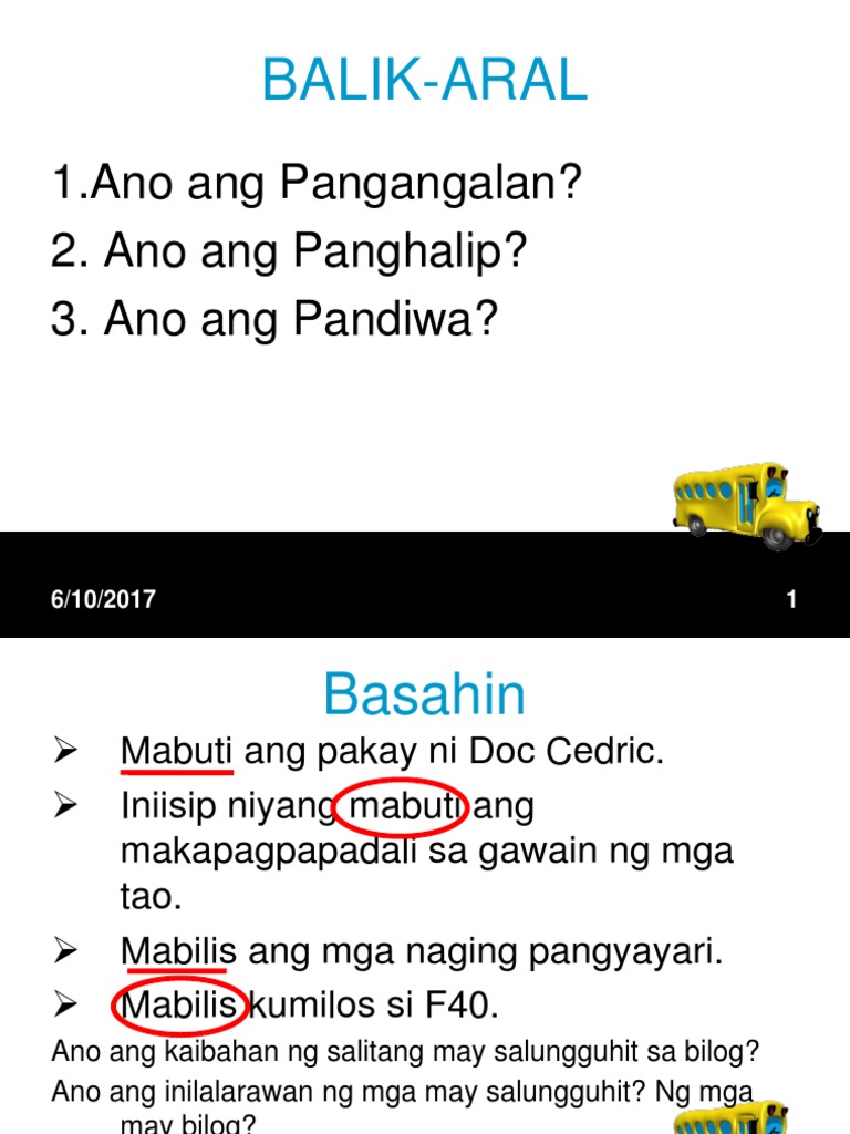 Isa sa mga uri ng pang-abay na kadalasan makikita sa mga pangungusap ay ang pang-abay na pamitagan. TAKDANG-ARALIN Pandiwa Pang-uri at Pang-abay I. Sa patlang bago ang bilang ay isulat ang uri nito.