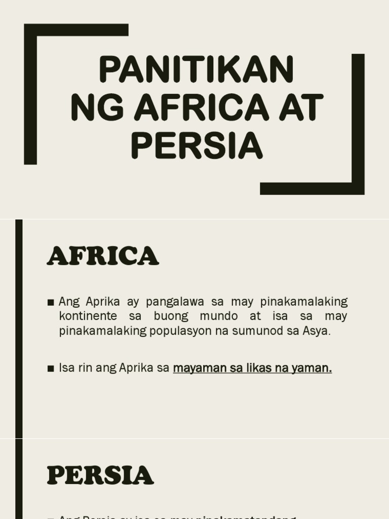 Httpsformsgle3CXXfiq7TNi4qyJ9ALIONGO Mitolohiya ng Kenya Isinalin sa Filipino ni. MITO NG AFRICA AT PERSIA Sa paksang ito ating pag-aaralan ang mga halimbawa ng mitolohiya na galing sa Africa at Persia. Pagkakaiba at Pagkakatulad ng Mitolohiya ng Africa at Persia AFRICA Kilala ang Africa bilang pangalawa sa pinakamalaking kontinente sa buong mundo at pangalawa rin sa dami ng populasyon sumunod sa Asya.