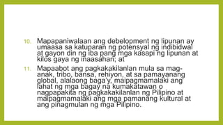 Itoy makikita sa bolunterismo at pakikilahok. Manangan Guro sa EsP 9 Mataas Na Paaralang Juan c. Naisabatas noong 1995 upang makapagbigay ng makabuluhang panlipunan at pangkapaligirang kaligtasan mula sa pagmimina kasama ang obligasyon ng mga industriyang nagsasagawa nito.
