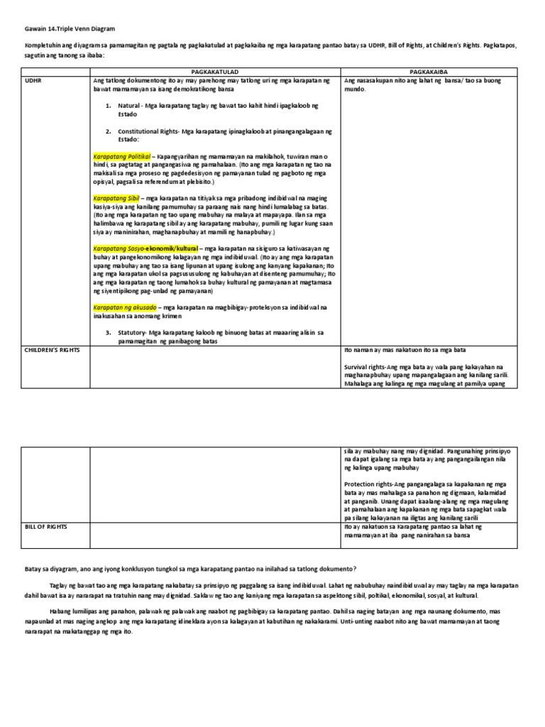 1 on a question Pagkakatulad at pagkakaiba ng mga karapatang pantao batay sa udhr bill of rights at childrens rights. Triple Venn Diagram Kompletuhin ang diyagram sa pamamagitan ng pagtala ng pagkakatulad at pagkakaiba ng mga karapatang pantao batay sa UDHR Bill of Rights at Childrens Rights. Madaming pagkakatulad at pagkakaiba ng UDHR Bill of Rights at Childrens Rights.