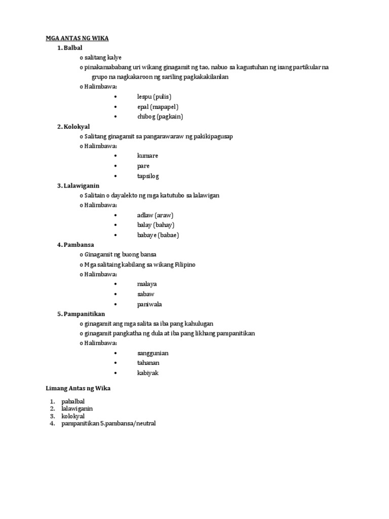 The Coptic language was spoken in Egypt in the centuries immediately following Jesus earthly ministry and the Sahidic dialect was an early literary form of the language. Tinatawag din itong singaw ng panahon sapagkat bawat panahon ay may nabubuong mga salita. Pabalbal Balbal May katumbas itong slang sa Ingles at itinuturing na pinakamababang antas ng wika.