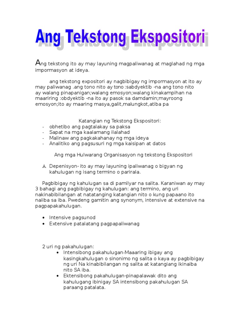 Week1 Docx Mga Uri Ng Teksto Aralin 1 Tekstong Impormatibo Ito Ay Isang Uri Ng Tekstong Madalas Ipabuo O Ipasulat Ng Inyong Mga Guro Sa Iba T Course Hero