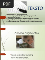 See answer 1 Best Answer. Pagtukoy sa layunin ng teksto 3. 2 Paglalarawan deskriptiv kung ang teksto ay bumubuo ng isang imahe sa pamamagitan ng paglalantad ng mga katangian nito.